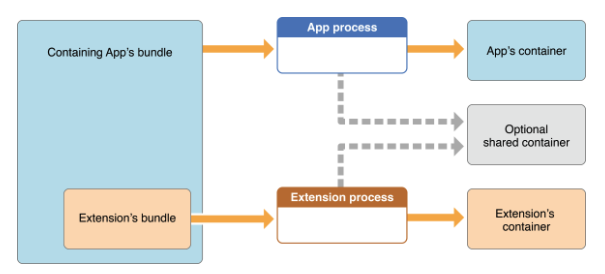 앱 프로세스와 extension process는 별도의 프로세스로 동작하기 때문에 두 프로세스가 공유하는 컨테이너가 있어야만 데이터를 공유할수 있습니다.