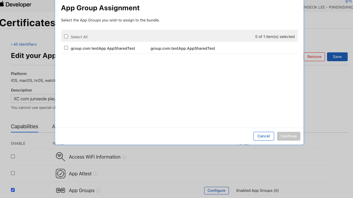 App > 우측 상단 + > App Groups 추가