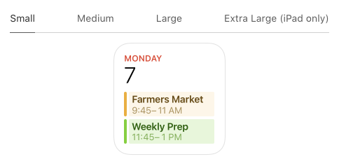 위젯의 크기를 함께 그룹화하고 단일 설명을 제공하십시오. 위젯을 여러 크기로 사용할 수 있는 경우 사람들이 각 크기가 다른 위젯이라고 생각하지 않도록 크기를 함께 그룹화합니다. 제공하는 크기에 관계없이 위젯에 대한 단일 설명을 제공하여 반복을 피하고 각 크기가 동일한 콘텐츠 및 기능에 대해 어떻게 약간 다른 관점을 제공하는지 사람들이 이해하도록 돕습니다.