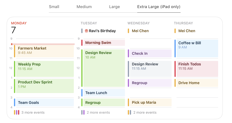 Offer your widget in multiple sizes when doing so adds value. In general, avoid simply expanding a smaller widget’s content to fill a larger area. It’s more important to create one widget in the size that works best for the content you want to display than it is to provide the widget in all sizes.